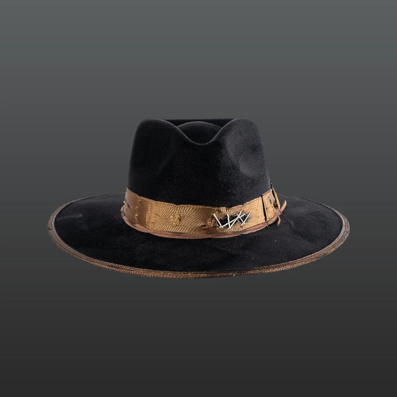 Subtle elegance in Amusement, a black hat enriched with a refined bronze ribbon. Crafted meticulously from premium suede. Constantly customize it with our diverse Hat Charms, from ethereal feathers to stylish pins, reflecting your unique charm and mood each day. It’s not just a hat—it’s a statement, it’s versatility, it’s Amusement.