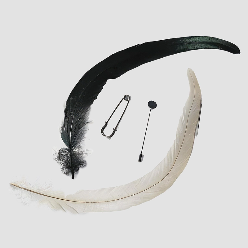 Introducing our Black & White Kit, a balanced blend of contrasting feathers, complemented by a versatile clip and a pin, allowing for varied placements and arrangements on your hat. This kit is a celebration of classic elegance and modern versatility, enabling you to personalize your hat to reflect your mood and style seamlessly.