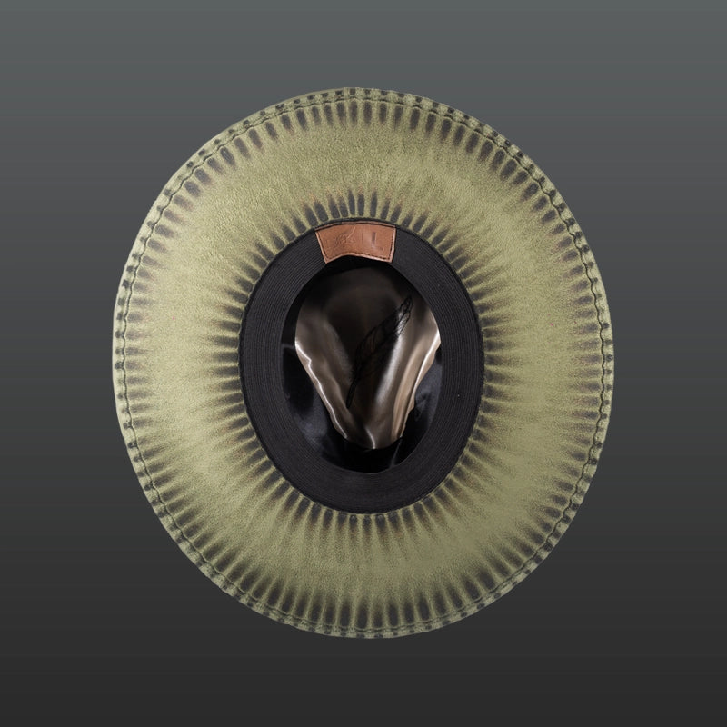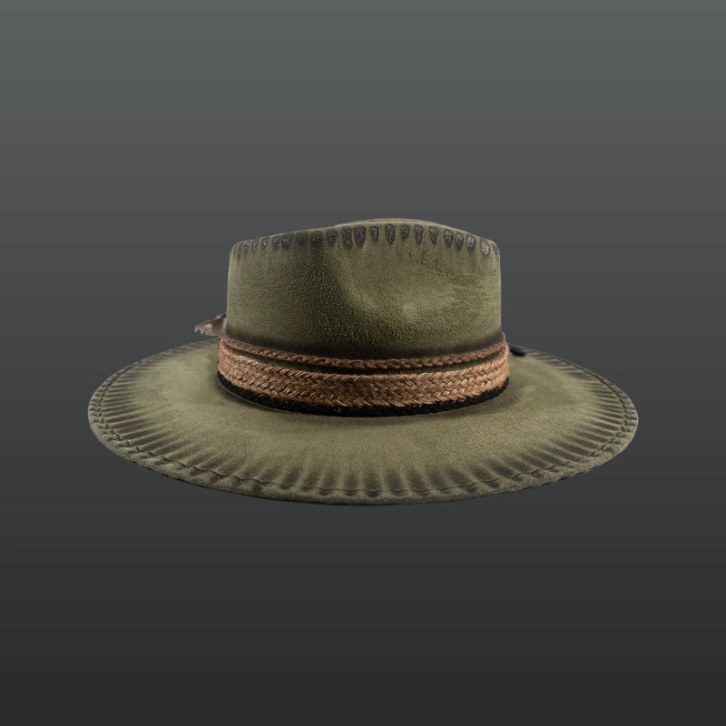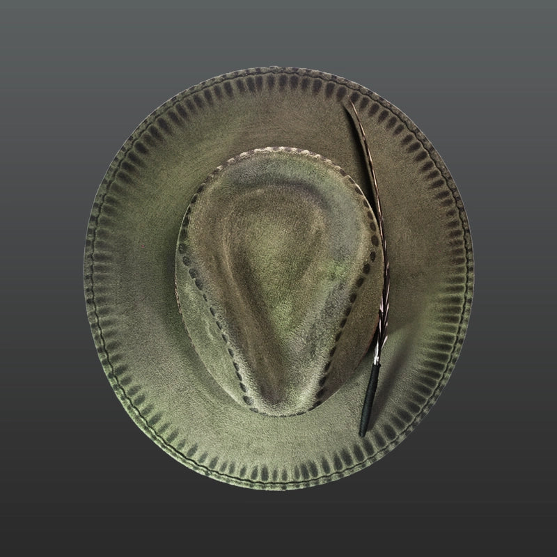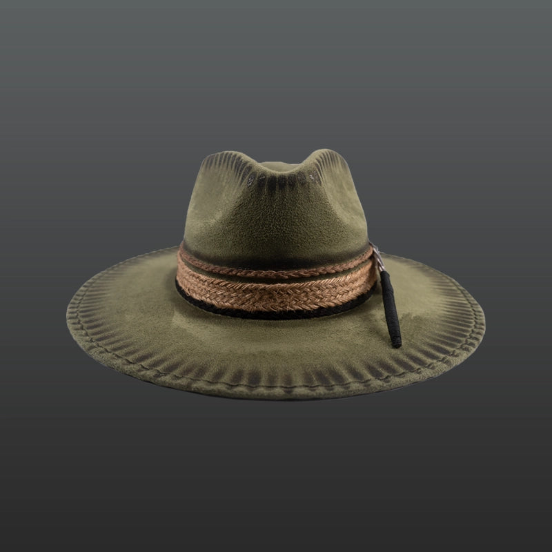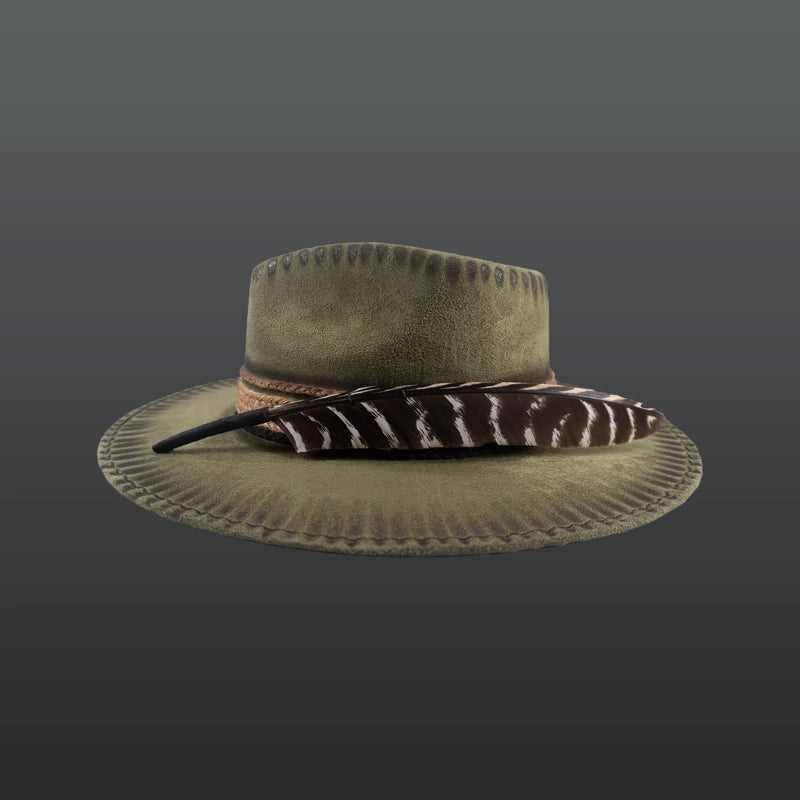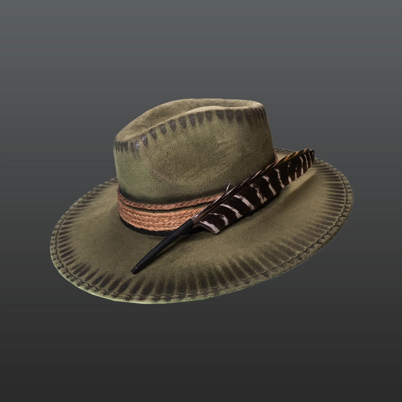 Artisan hat with jute strips, camel-colored braided leather and black suede strip, incredible burnt details, ocellated turkey feather and creative interior. For the fine and elegant.