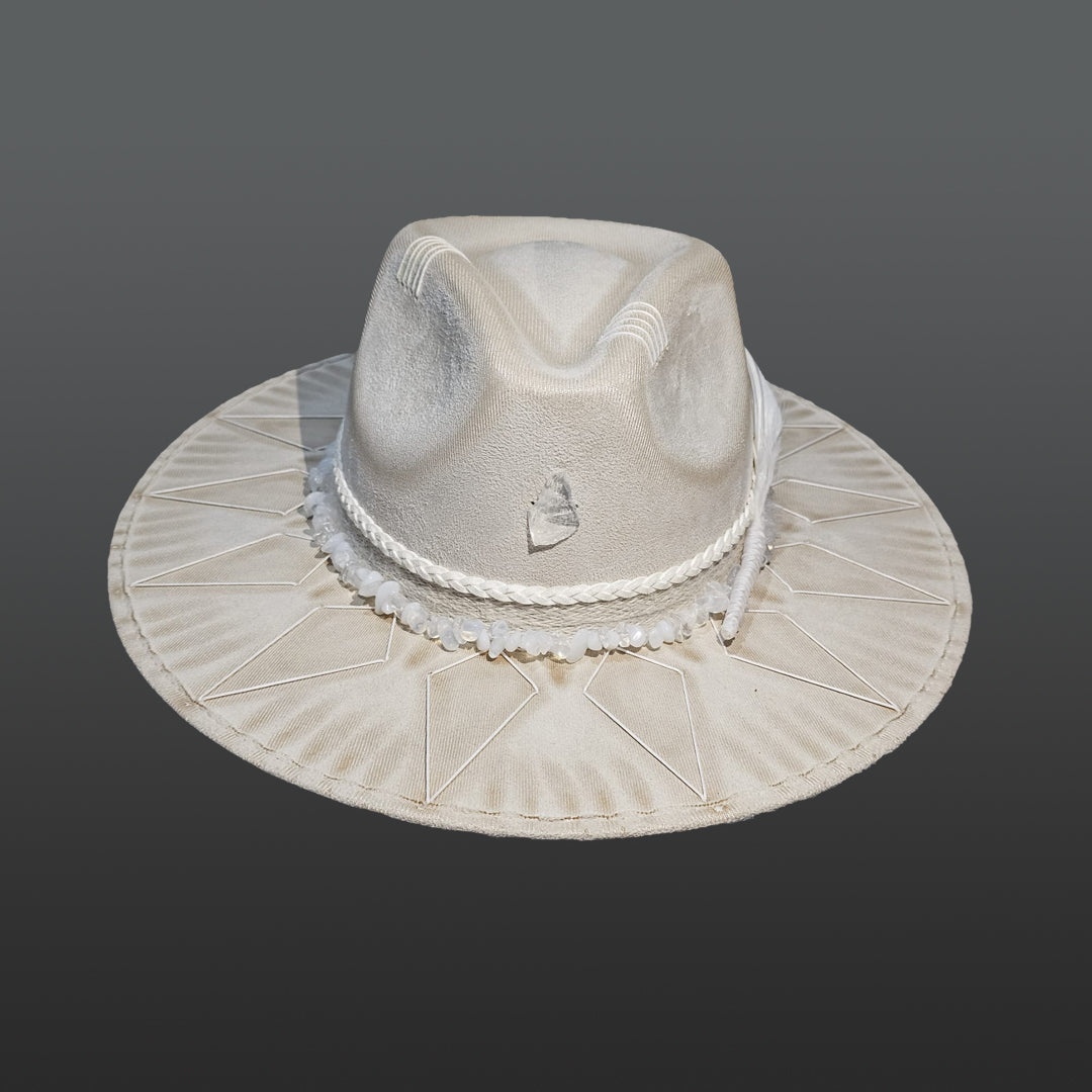 Elegant and eye-catching, this hat is a masterpiece filled with intricate details, from hand-embroidered designs to finely crafted shading. It takes six hours to create, and features quartz accents to protect you wherever you go. It will be the perfect companion for every adventure. Whether you're headed to the beach, a festival, a dinner, or a wedding, this hat will be loved by you and admired by others 🤍
