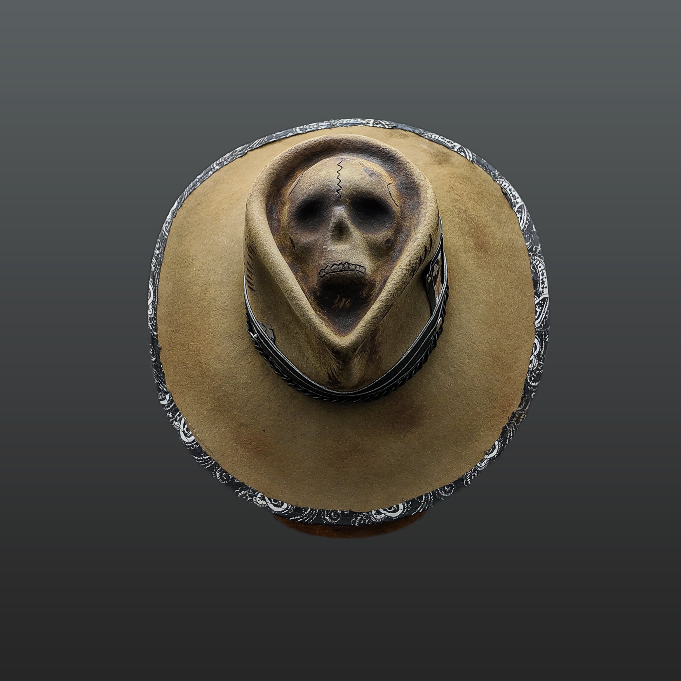 Cowboy-style felt hat, entirely handcrafted using steam shaping techniques. This one-of-a-kind piece features a skull centerpiece and exceptional details: artistic shading, engravings, chain, playing cards, leather, textures, and more.