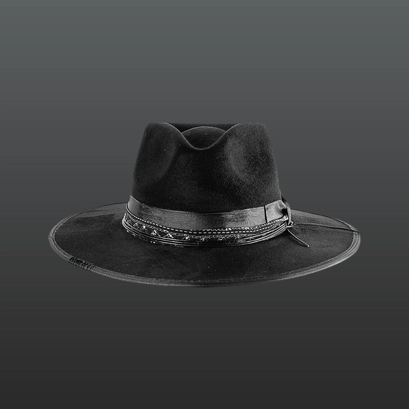 Explore sophistication with Resilience, a chic black hat paired with a matching ribbon and strap. Made from the finest suede, its appeal is amplified by our assorted Hat Charms. Elevate your look every day by personalizing it with charms that resonate with your essence and mood. It's not just an adornment—it’s versatility, it’s your Resilience.