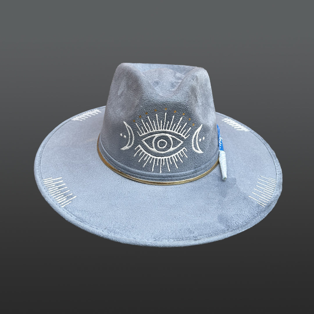 This beautiful sky-blue design was inspired by a lovely client who combined the energy of the Sun, the Moon, and the Evil Eye into a single hat. In harmony, full of love, it will look magical on you 🪄